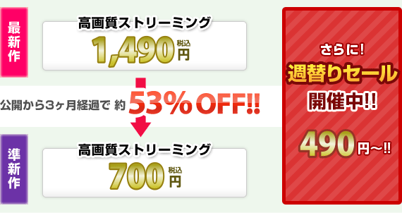 画質や作品タイプごとに、お求めやすい価格でご用意しております。公開から3ヶ月経過で約53%OFF!さらに週替りセール490円~も絶賛開催中です!!