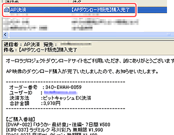 ⑩ メールアドレスに「【AP単品動画販売】購入完了」の件名でメールが届きます。このメールは大切に保管しておいて下さい。 |